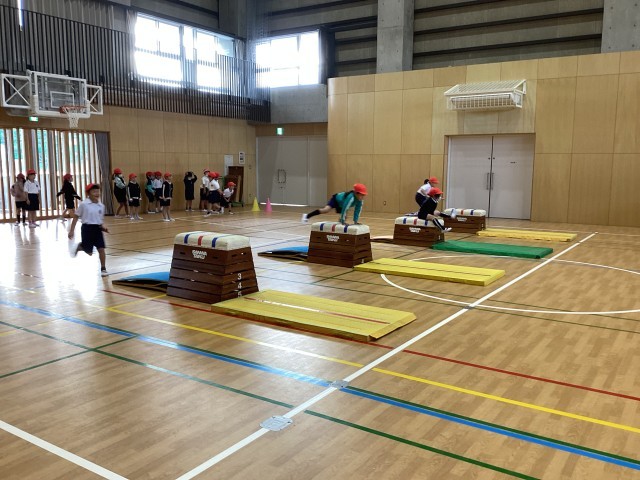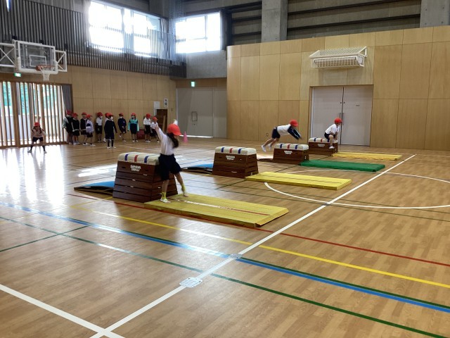 跳び箱の授業の様子です。手はパーで、跳び箱につく手の位置に気をつけて練習しています。
