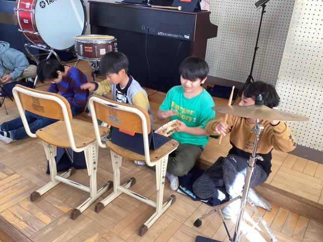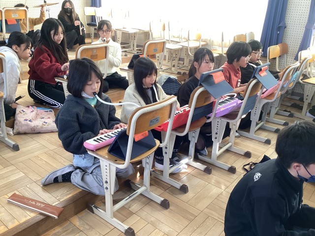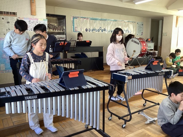 合奏の練習をしています。パートに分かれて、仲間と相談しながら演奏を頑張っています。