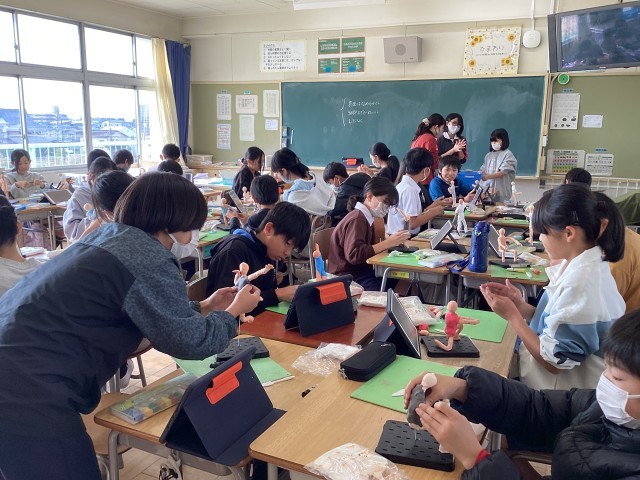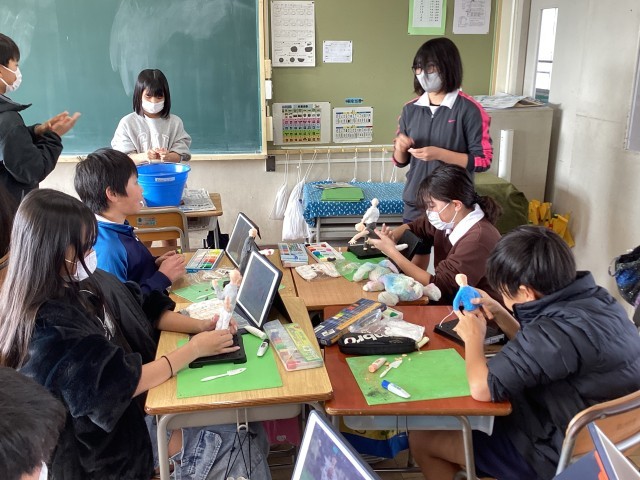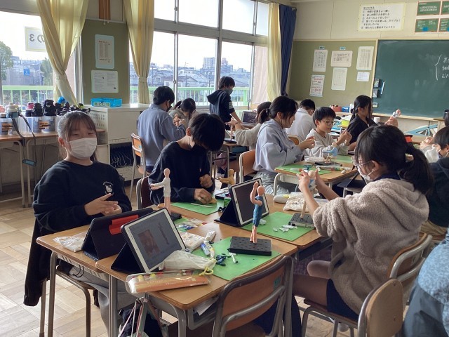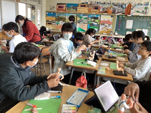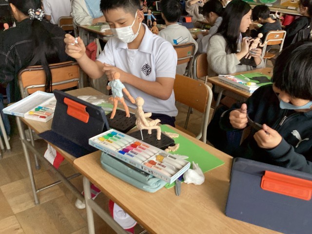 未来の自分がしたいことを思い浮かべて、その姿がよりよく伝わるようなポーズや場面を粘土で作っています。絵の具で色を混ぜてさまざまな色の粘土を作って作品作りを進めています。