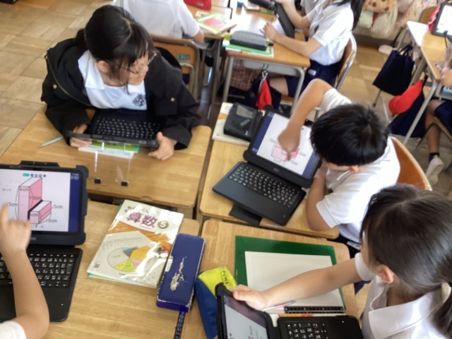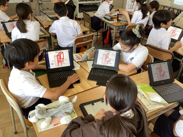 直方体や立方体の体積の公式を使って、L字型の体積を求めました。