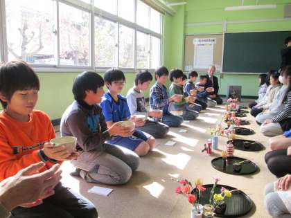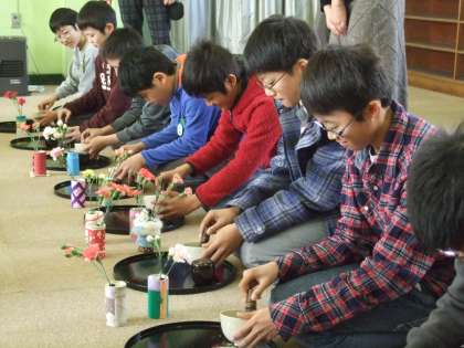 お茶やお花といった日本の文化に触れ、その良さを知るとともに、体験活動を通して、感謝の心や思いやりの心を育てることを目標に、MOAの皆様を講師にお迎えして、茶の湯体験を行いました。中には初めてお抹茶を飲んだ児童もおりました。友達のために心を込めてお茶をたてる、たててもらったお茶をいただく、ということでお互いを大切にする気持ちがさらに深まったように感じます。