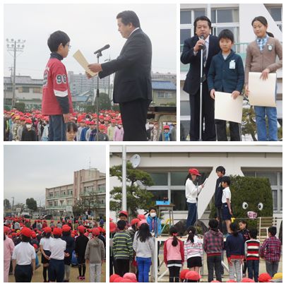 今日の朝会ではたくさんの表彰を行いました。はじめにござんじ公園の愛称と壁画の協力に対して、4年児童と6年生へ、続いて第61回読書感想画愛知県コンクール、読書感想文愛知県コンクールで優秀な成績を収めた児童のみなさんに、表彰状が渡されました。さらに人権を理解する作品コンクール書道の部で優秀な成績を収めた2名の児童にも表彰状が渡されました。続いて運動委員会から過日行った大縄大会の表彰を行いました。