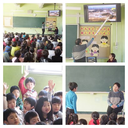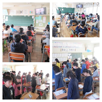 今日は東日本大震災が起きた日です。震災の日から5年になります。半旗を掲揚し、弔意を表しました。東松島市出身で、多くの親戚の方が被災された小川さんを講師にお招きし、「地震のお話を聞く会」を行いました。はじめに校長先生から震災のお話があり、亡くなられた方に黙祷を捧げました。その後、スライドの写真を見ながら、東日本大震災についてお話を聞きました。当たり前のことが当たり前にできる日常を大切にしたい、心からそう思いました。1年生は、第1時限に、ふれあいホールで、小川さんから詳しく震災の時の様子を教えていただきました。子どもたちの質問にも丁寧に答えていただきました。