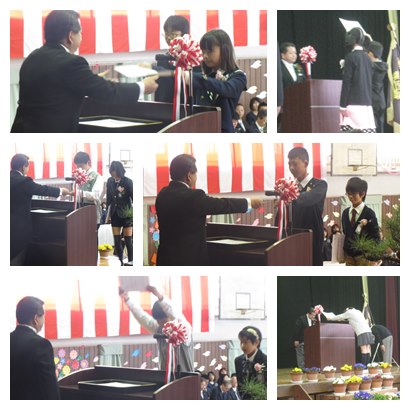 うららかな春の日差しの下、第69回卒業式を行いました。142名に卒業証書が渡され、校長先生の式辞からは、卒業生の元気よく活動する姿、低学年に優しく接する姿、黙々と掃除などに取り組む姿が思い出され、思わず涙がこぼれる場面もありました。