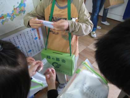 業前に園芸委員が緑の募金箱を持って、各学級に募金を呼びかけました。たくさんの児童が募金をしてくれました。ありがとうございました。みなさんの気持ちで、緑が増えていくとよいですね。明日18日まで行います。