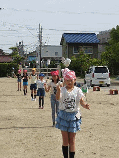 運動場で初めてトワリングの練習をしました。軽快な音楽に合わせて、リズミカルにトーチを回していました。