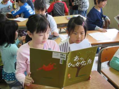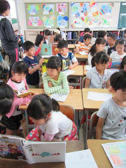 今日はなかよしペアのお兄さんお姉さんが2年生のために本を読んでくれました。2の4は読んでもらいたい本を準備し、わくわくしていました。4の4のお兄さんお姉さんは、とても上手に読んでくれるので、みんな本にひきこまれていました。