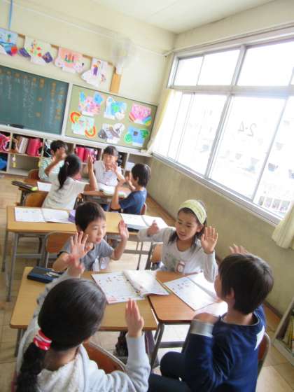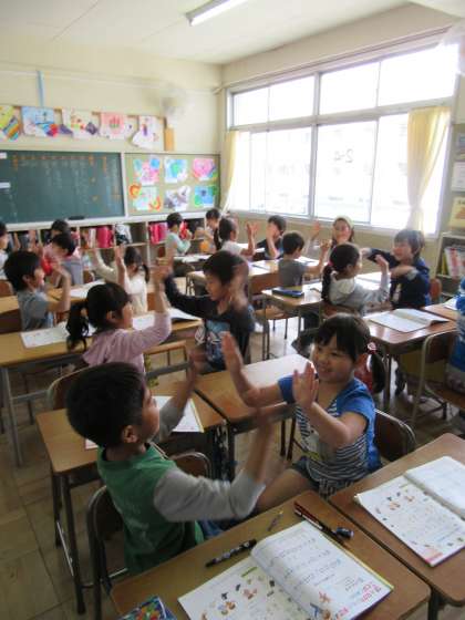 今日の音楽は「こいぬの ビンゴ」を歌ったり、歌のかわりにリズムをうったりしました。一人で練習したあと、手拍子のかわりに隣の席の子や班でハイタッチをしました。最後はリズムがぴったりでみんなのハイタッチの音がきれいにそろっていました。