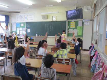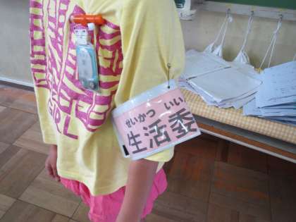 毎週金曜日、生活委員が各学級へ行き、週目標の確認やくつの整頓状況について伝えます。生活委員が「今週の目標、『名札を忘れずにつけよう!』が守れた人?」の問いかけに、大勢の児童が挙手していました。