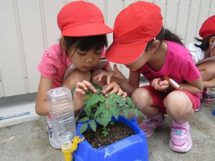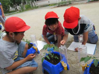 「かんさつ名人」になるためにミニトマトを丁寧に観察しました。つぼみの数を数えたり、ものさしで茎の長さを測ったり、はっぱの表と裏のさわりごこちを比べたりと、真剣に取り組んでいました。