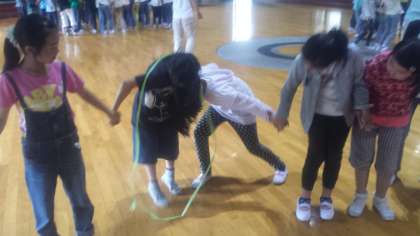 学年レクの名前は、ひも渡しゲームです。皆、苦労しています。