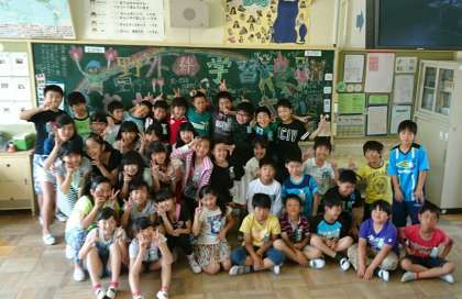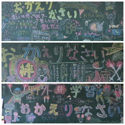 野外活動が終わり、久しぶりの学校でした。朝教室に入ると、びっくり!!6年生からの温かいメッセージが黒板いっぱいに書いてありました。どの子もとても嬉しそうにじっくりと黒板を見つめていました。