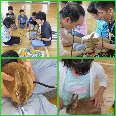 ウサギの世話をしている飼育委員会の児童に、えちぜん動物病院の先生がウサギの正しい飼育の仕方をご指導に来てくださいました。えさの種類や与え方などプレゼンを見せていただきながら、わかりやすく説明をしてくださいました。一人一人に聴診器を貸してもらい、ウサギをだっこして心臓の音を聞きました。「僕たちの心臓の音より速い!」驚いていました。ウサギの前歯を見て、「きれい!虫歯はないの?」と質問する児童もいました。