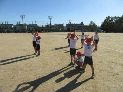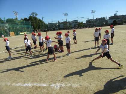 体育の時間、空を見上げると雲一つない青空でした。「かげおくりのよくできそうな空だなあ。」国語科で学習し始めた「ちーちゃんのかげおくり」で出てくるこの台詞がよく合う空だったので、体育の授業後、全員でかげおくりをしました。物語の中だけのことだと思っていた児童もいたようで、初めてのかげおくりはみんな大興奮でした。