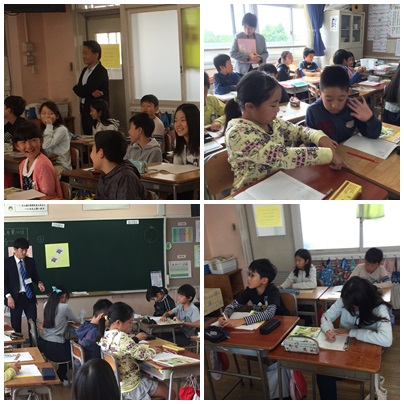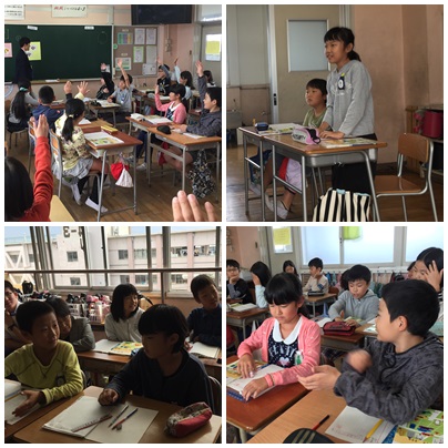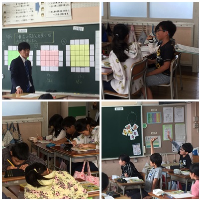 4年生では、面積の学習をしています。今日は、花壇の広さをどのようにして求めたらよいかをみんなで考えました。ペアや全体の話から「アとウの花壇を重ねるとよい。ブロック(マス)の数を比べたら分かる。」など活発な話し合いができていました。花壇の広さは、数字で表すと比べやすいことを学びました。