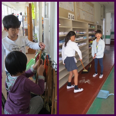 2年生・3年生も掃除道具をきちんと整頓したり、自主的に下駄箱の床の砂を掃いたりしてがんばっています。