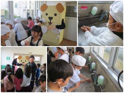 1年生 ゴッシーと手洗い 公開日 2017/11/09 更新日 2017/11/09 1年生 ○ 11月9日(木) 給食の準備の時間にゴッシーが1年生の手洗い場に来てくれました。 ゴッシーが一緒だとさらに上手に手洗いができます。 いいね(0)