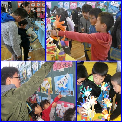 1年生と6年生のペア鑑賞 公開日 2017/11/17 更新日 2017/11/17 学校行事 ○ 11月17日(金) 1年生と6年生のペアで作品展の鑑賞会を行いました。自分の作品のがんばったところ、お互いの作品の良いところを話しながら、仲良く楽しく交流することができました。 いいね(0)