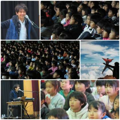 2・3限目に体育館で弓削田健介さんによる「いのちと夢のコンサート」が行われました。弓削田さんは、全国を旅しながら、年間150〜200回のコンサートを行ったり、各地の合唱団に楽曲を提供したりして、「放浪の合唱作曲家」と呼ばれているそうです。今年の夏は、富士山の頂上でたくさんの登山客とコンサートを行ったことで、話題になった方です。