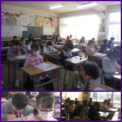 5年2組は、社会のテストに取り組んでいました。今までの学習を振り返り、一生懸命頑張っていました。