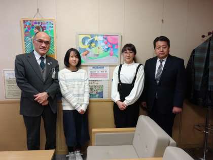 5年生の児童の作品が、本日より、市役所の教育長室に掲示されています。昼の休み時間、校長先生と一緒に、教育長室まで絵をもっていき、掲示していただきました。絵の題は、「小鳥の世界」です。天気をあやつる不思議な鳥が、昼と夜の天気を動かしている様子が描かれています。色の濃淡や遠近法を使って立体的に表現されています。教育長先生から「創造力豊かなすてきな作品です。」とほめていただきました。