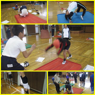 5年1組は、体育の授業に取り組んでいました。後転や倒立など、友達とアドバイスをし合いながら練習をしていました。