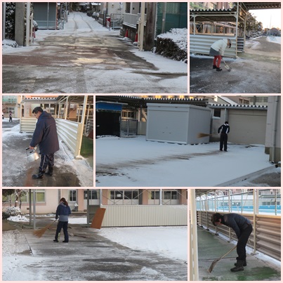 全国大寒波で、岩倉にも雪が降りました。早朝から職員で雪かきをしました。昨日から凍らない対応をしていたので、校内はずいぶん安心です。