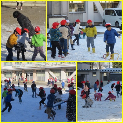 1・2年生 雪を楽しみました 公開日 2018/01/25 更新日 2018/01/25 今日のできごと ○ 1月25日(木) 中庭に積もった雪が溶けないうちに・・・ 1・2年生は、生活科の冬の遊びをしました。雪合戦、雪だるま作りなど一人一人が雪を楽しみました。 いいね(0)