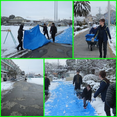 雪対策大成功! 公開日 2018/01/26 更新日 2018/01/26 今日のできごと ○ 1月26日(金) 子どもたちが通る場所に、昨日ビニールシートを敷き、雪対策をしました。 今朝シートをめくると、下は全く雪のない安全な通路になっていました。 雪かきをすることなくすっきり!です。 いいね(0)