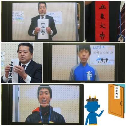 校長先生から2月3日(土)は節分、4日(日)は立春という暦のお話を聞きました。『立春大吉』というお札を玄関に貼ると鬼を追い出し、厄除けになるそうです。立春大吉という字は左右対称で、裏から見ても読めます。鬼が入ってきても、裏からも読めるので、まだ訪ねていない家があると思って、すぐに外へ出て行ってしまうという日本の古くからの言い伝えです。