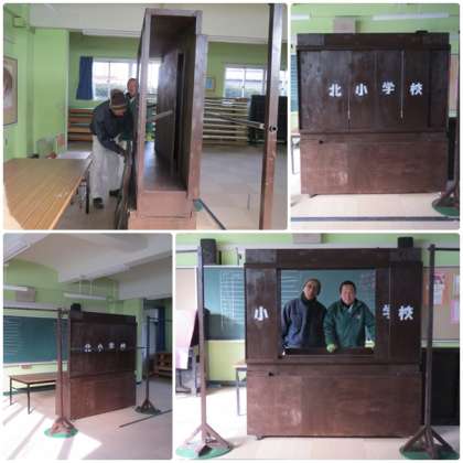 これは、大型紙芝居や人形劇に使う大道具です。普段、校内のあちらこちらを修繕してくださる営繕員さんが、こつこつ制作してくれた物です。