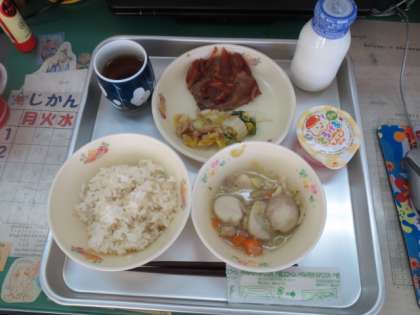 今日の給食は、シェフのスペシャルメニューでした。岩倉野菜のポトフ、ポークチャップ、ちっちゃい菜と白菜のサラダ、発芽玄米ご飯、豆乳プリン、牛乳がでました。
