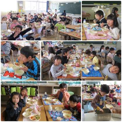 1年生の教室では、「お肉とご飯を一緒に食べるとおいしいよ」とお話しながらおいしそうに食べていました。