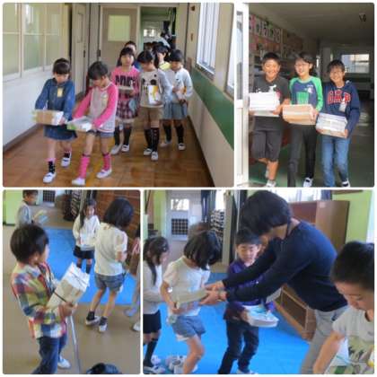 たくさんの児童が、ふれ合いホールから教室まで教科書を運んでくれました。ありがとう。