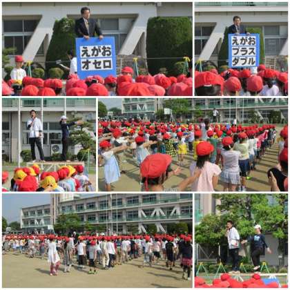 始めに校長先生のお話を聞きました。挨拶をするときなどに、「笑顔→あいさつ→笑顔」のように笑顔ではさむと、相手も気持ちがいいです。「えがおオセロ」「えがおプラスダブル」をキーワードに、笑顔を意識していきましょう。