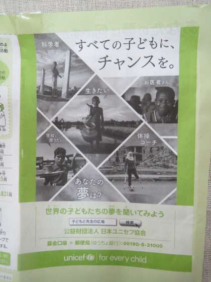 世界の子どもたちのさまざまな支援に使っていただけるように振り込みました。