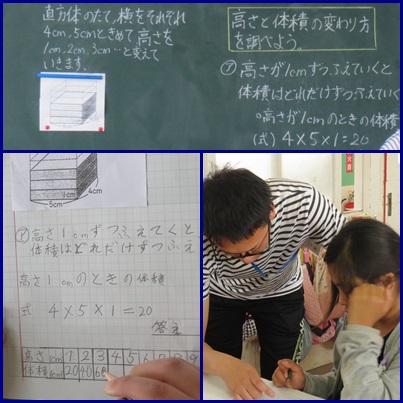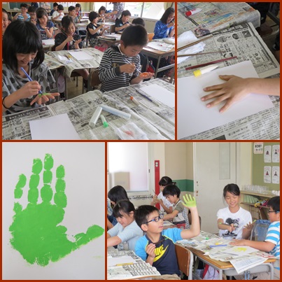5年生の授業風景 公開日 2018/05/08 更新日 2018/05/08 5年生 ○ 5月8日(火) 5年2組は、学年で掲示する手形をとりました。絵の具を手に塗り、色んな形の手形ができました。 5年4組は、算数の授業に取り組んでいました。体積の大きさの変化を表を使って調べていました。 いいね(0)