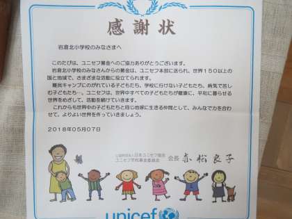 5月7日に皆さんからの募金が、ユニセフ本部に送られ、日本ユニセフ協会から、感謝状が届きました。