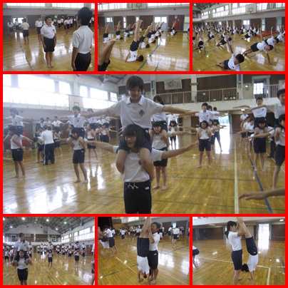 組み立て体操の練習をしました。本日は、一人技の確認と二人技に挑戦しました。補助倒立やサボテンの技を磨きました。二人で息を合わせ、何度も練習をしました。