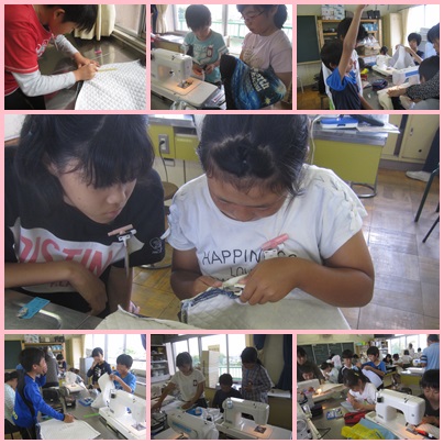 6年3組は、家庭科の授業に取り組んでいました。いよいよナップサックも完成間近♪中には、ひもを通して実際に使用している子もいました。