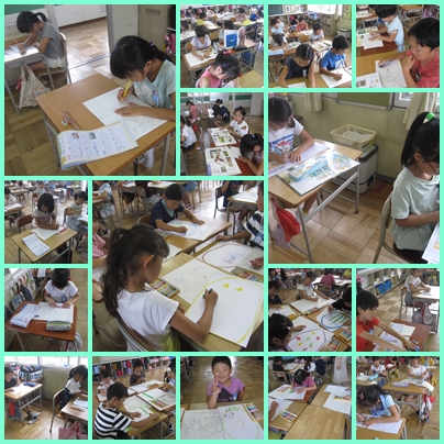 生活科では、生き物について調べて新聞づくりを行っています。図鑑を見て、生き物の特徴をまとめていました。