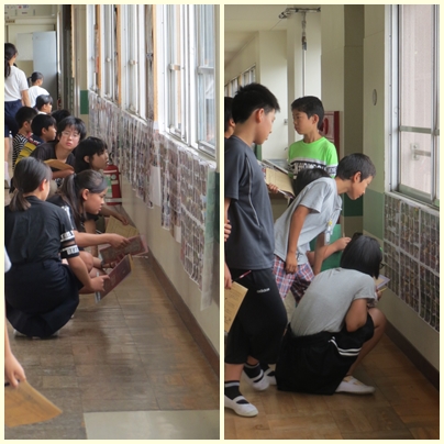 修学旅行に写真が、6年生の廊下に貼ってあります。休み時間に子どもたちは夢中で見ています。