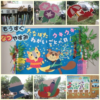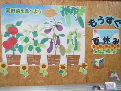 図書館に行くと、夏休みが待ち遠しいです。かき氷、セミ、夏野菜、アサガオなど夏の掲示が満載!