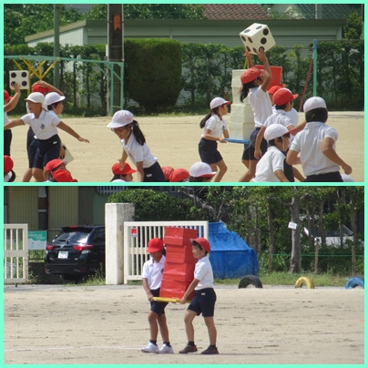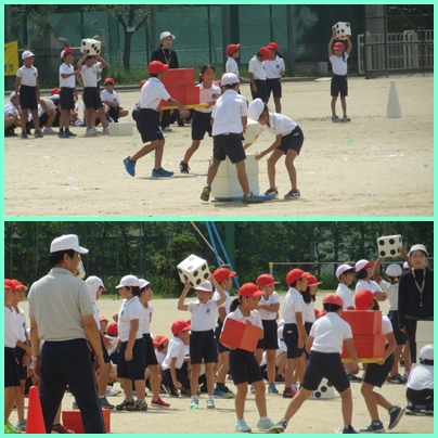 3年生の学年競遊は、さいころを転がし出た目の数だけの箱を御神輿に乗せ、2人で協力して運ぶ競技です。