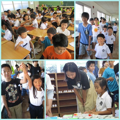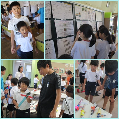 1年生は「ロケットポン」6年生は「自由研究」を夏休みの間に一生懸命制作してきました。お互いの作品の素敵なところを伝え合いました。