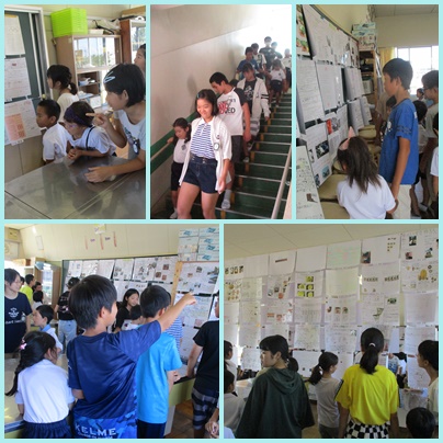 ペアで、夏休みのお互いの作品を見せ合い鑑賞をしました。久々のペア活動に1年生も6年生も嬉しかったようで、笑顔いっぱいで手をつないで作品展をまわりました。