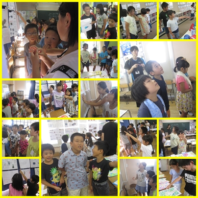 夏休みに作った作品を、ペア学級の子と一緒に見に行きました。自分の作品を紹介し、ほめ合っていました。2年生にとって、自由研究の方法を学ぶことができ、とても有意義な時間でした。2学期も、ペア活動を大切にしていきたいですね。