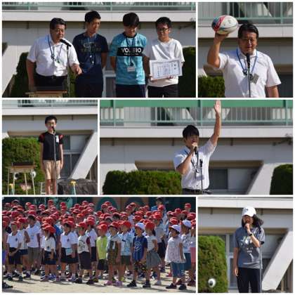 次に、校長先生からラグビー用語の「ノーサイド」という言葉についてのお話がありました。北小の運動会でも「ノーサイド精神」を見習い、戦った相手でも試合が終われば仲間になれるような意識で取り組みましょう。