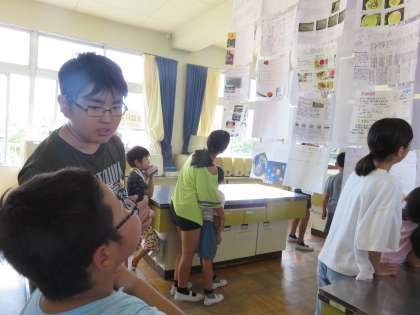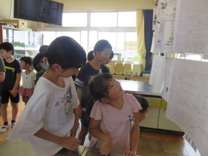6年4組と1年4組でペア鑑賞をしました。お互いの作品のいいところを見つけ、伝え合いました。