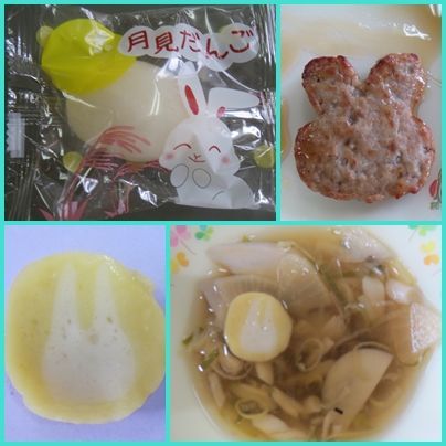 給食も中秋の名月 公開日 2019/09/13 更新日 2019/09/13 今日のできごと ○ 9月13日(金) 今日は、中秋の名月です。 給食にウサギの絵がはいったかまぼこ、団子、ウサギ型のハンバーグなどが出され、子どもたちはうれしそう! 今夜大きな満月が見られるといいです。 いいね(0)